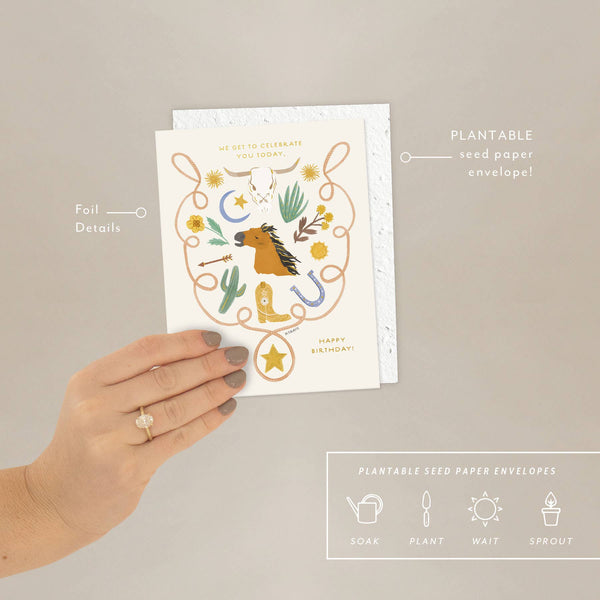 All Seedlings greeting cards have foil details and a PLANTABLE seed paper envelope which is embedded with wildflower seeds. This seed paper is made of a biodegradable eco-paper created with post-consumer materials - no trees harmed for this paper! When planted, our envelopes compost away leaving only flowers behind. Blank inside, our cards are printed on premium paper and are all accented with foil details. All Seedlings cards are made in the U.S.A. Card size: 4.25" x 5.5" Env: 4.3125" x 5.75" (A2)
