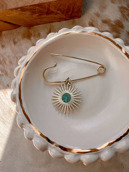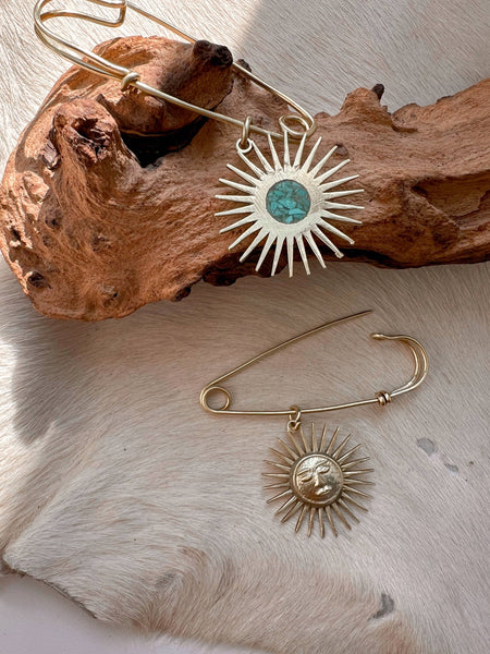 This handmade brass safety pin is basically a vibe check for your outfit. Featuring a sleek brass sun with a "secret's out" turquoise inlay on the back, it’s giving major "main character energy" while keeping things low-key.