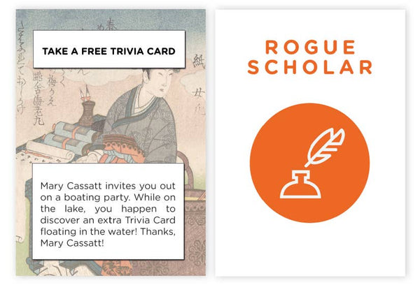 Box contains 300 Trivia Cards, 45 Artwork Cards, 36 Rogue Scholar Cards, and instruction sheet