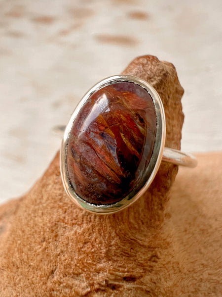 Find your inner strength with this captivating ring! This red hawk's eye stone seems to glow from within, with a lovely subtle shimmer that catches the light. Securely set in a polished sterling silver bezel, this handcrafted piece adds a touch of earthy magic to your hand. It's a sweet, powerful little treasure. -hawks eye (9×13mm) -Sterling Silver Setting -Size 7.75 ONE OF A KIND “Spiritually, lapis lazuli symbolizes truth, wisdom, inner peace, and enlightenment. It is associated with honesty, self-awareness, and communication, and it is believed to balance and activate the Third Eye chakra to foster intuition and spiritual connection. Historically, it was a stone of royalty, strength, and power, and in metaphysical practices, it is used to promote spiritual growth and protection.”