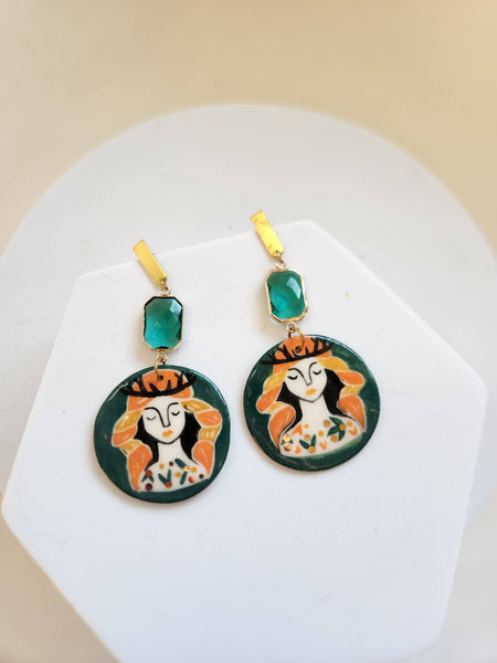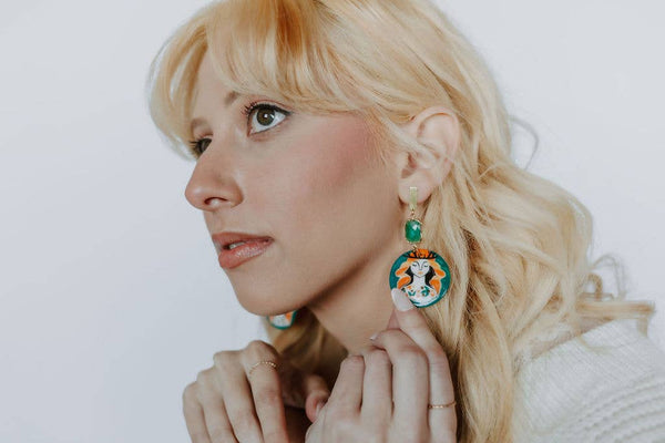 Handmade porcelain earrings, hand painted with a variety of glazes, including 22k gold luster accents. Top piece is raw brass with stainless steel post, hardware is green glass and raw brass. Ceramic pieces are painted solid gold on the back. Each earring measures approximately 2.75” long and weighs less than a quarter of an ounce.